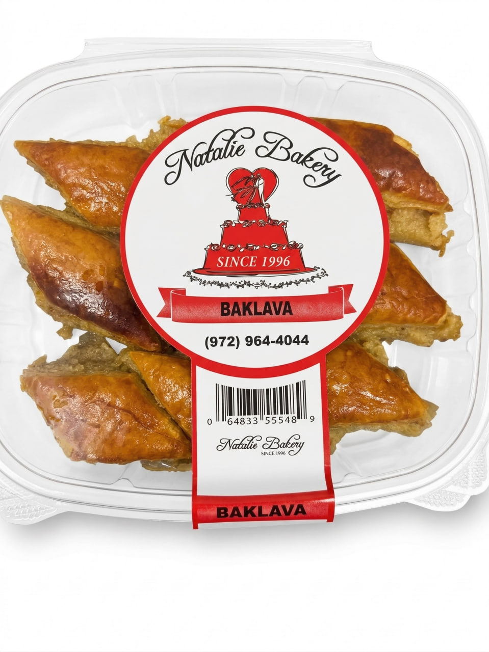 Treat yourself to the golden, honey-drenched layers of our Natalie Bakery Baklava. Since 1996, we have been perfecting the art of this Mediterranean classic in Carrollton, TX. Each piece is meticulously crafted with dozens of thin, flaky phyllo dough sheets, layered with a rich, spiced nut filling, and finished with a delicate sweet syrup that melts in your mouth.