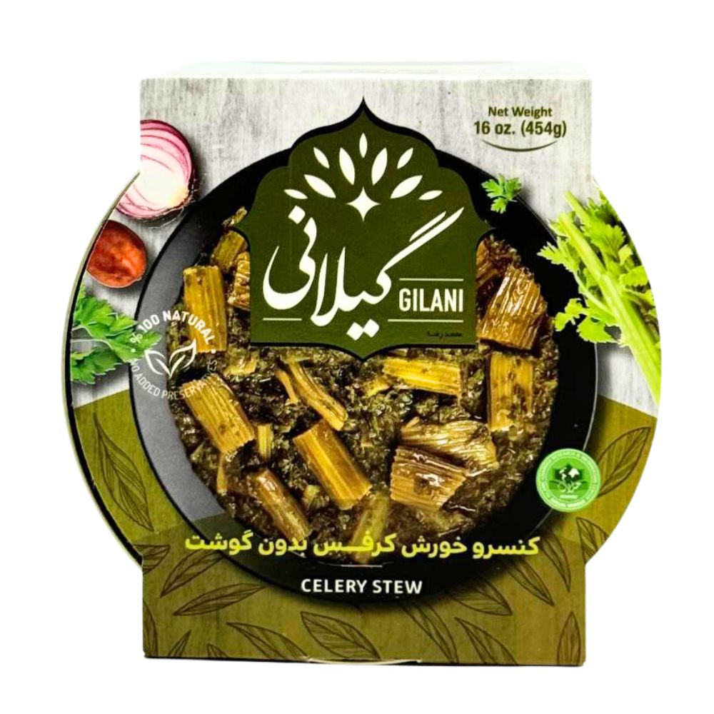 Authentic Gilani Celery Stew (16 oz), a flavorful herb blend for creating the traditional Persian dish “Khoresht-e Karafs.” Ideal for Mediterranean cooking.