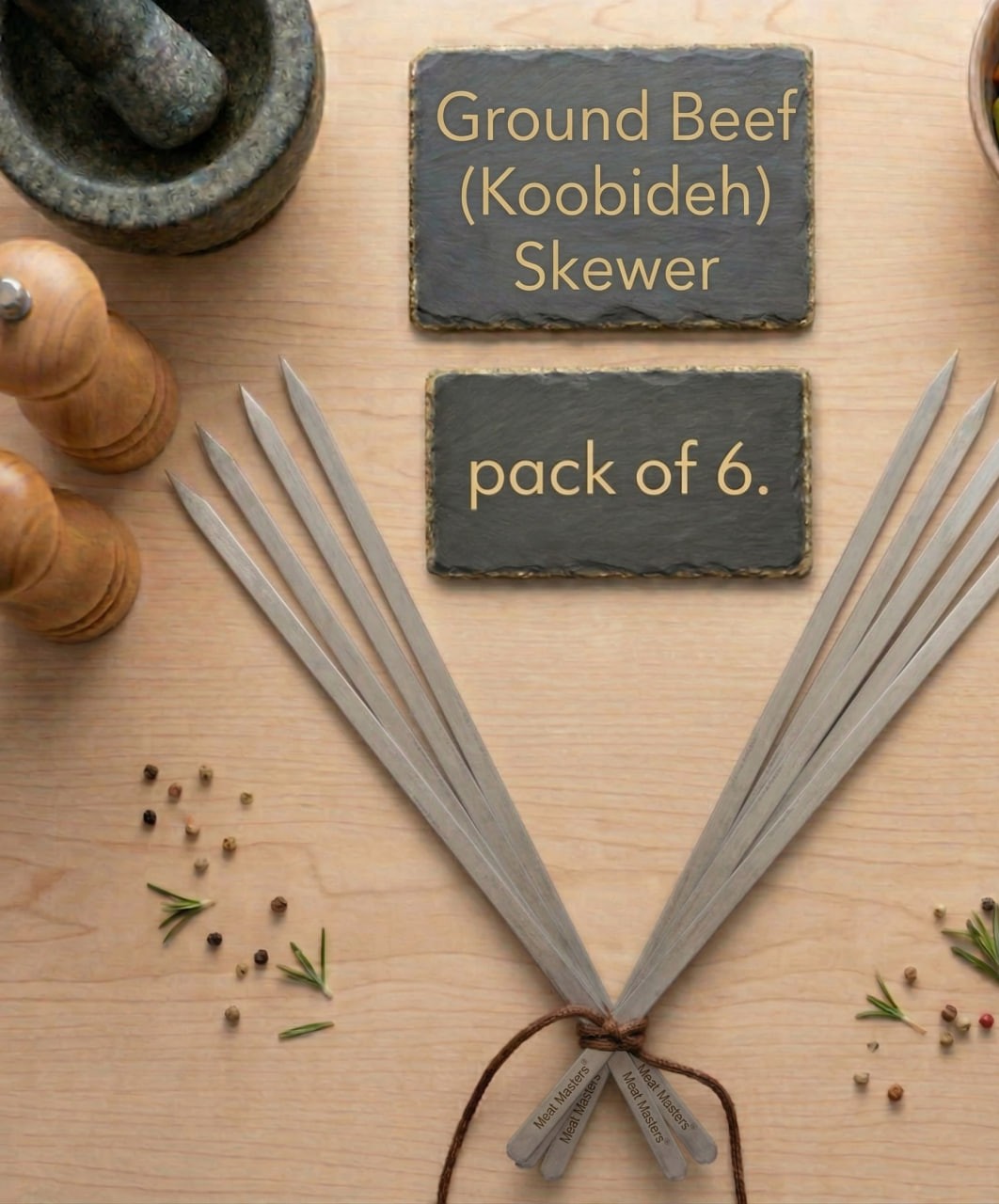 Craft the perfect Koobideh kebabs with these specially designed Ground Beef (Koobideh) Skewers. Made from durable stainless steel, these flat skewers hold ground meat firmly in place, preventing it from slipping or rotating while grilling. Ideal for Persian, Middle Eastern, and Mediterranean-style kabobs, these skewers provide even cooking and easy handling over charcoal or gas grills. Whether you’re preparing koobideh at home or for a restaurant, these reusable skewers deliver the traditional grilling experience every time.