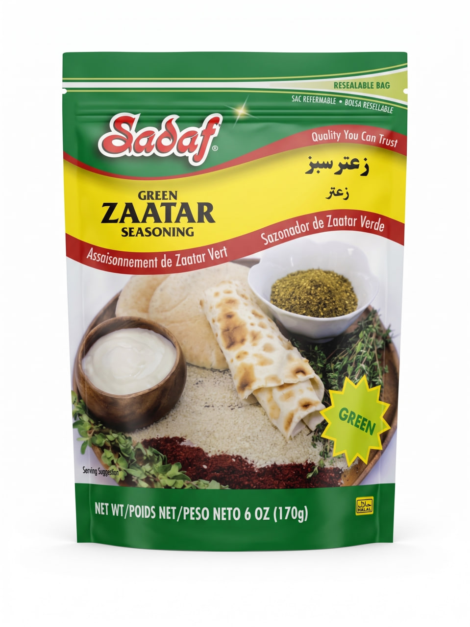 Elevate your meals with the vibrant, tangy, and earthy flavor of Sadaf Green Zaatar Seasoning. This traditional Middle Eastern herb and spice blend is perfect for mixing with olive oil, sprinkling over warm pita bread, or seasoning creamy labneh and roasted vegetables. Packaged in a convenient 6 oz resealable bag to lock in its fresh, highly aromatic quality.